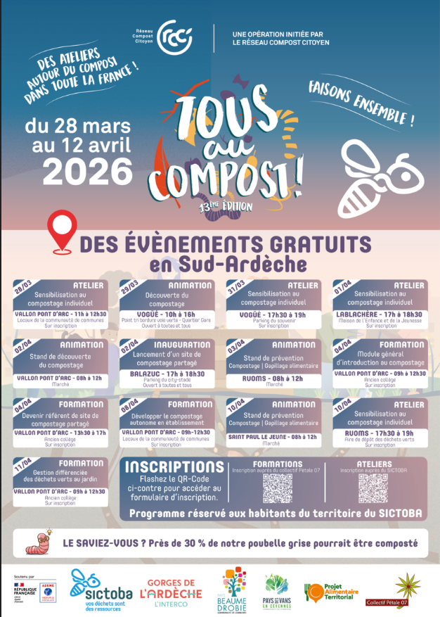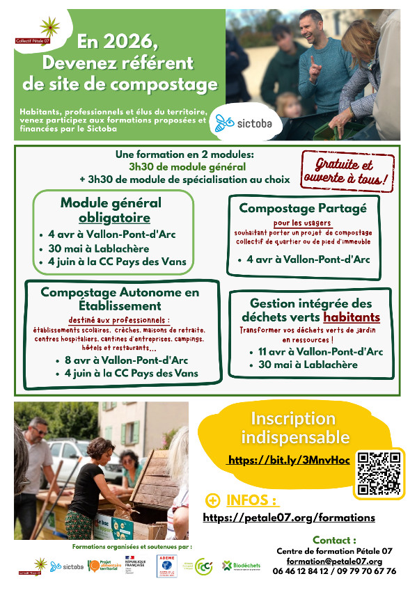 Financées par le SICTOBA, les sessions sont sans frais pour les participants. Elles sont organisées et encadrées par un maitre composteur et un guide composteur du Collectif Pétale 07. Elles sont agréées par le Réseau Compost Citoyen national et soutenues par l’ADEME.