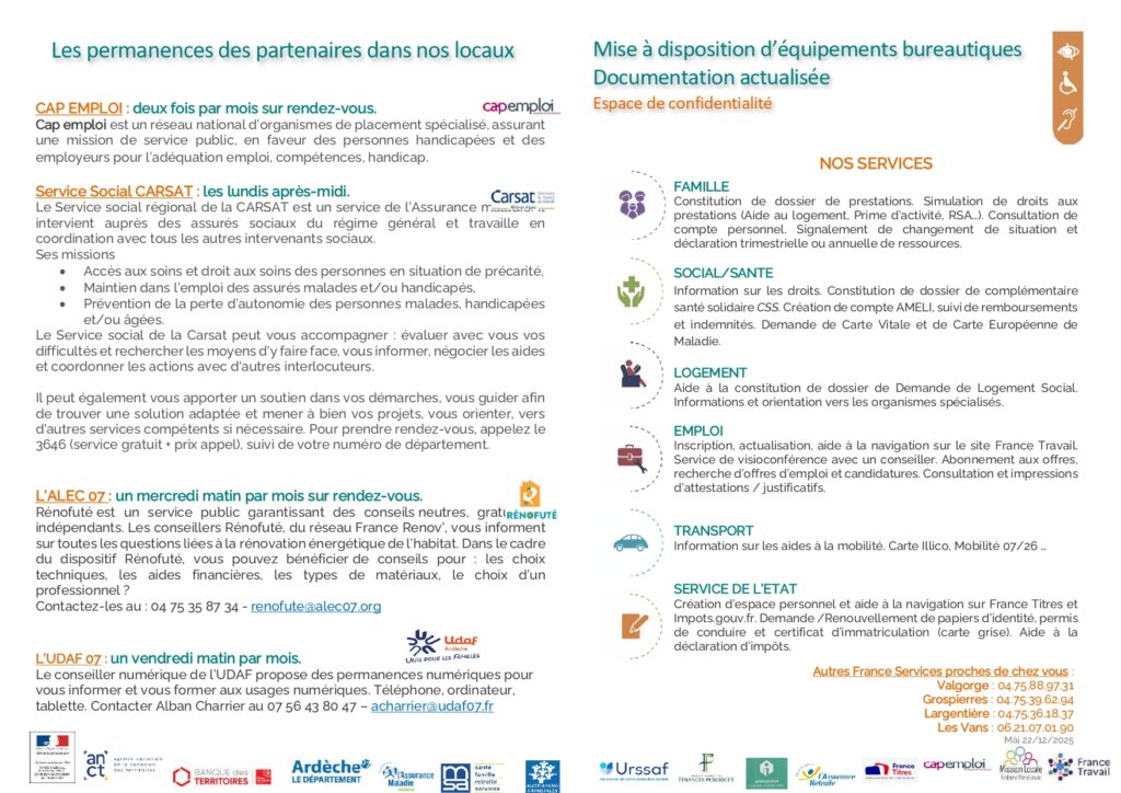 Être habitant de Sablières, c’est choisir un cadre de vie préservé — mais ce n’est pas renoncer à ses droits ni à l’accès aux services publics. Nous disposons en effet d’éléments concrets pour accompagner chacun dans ses démarches administratives et sociales, grâce notamment à la Maison France Services de Joyeuse – véritable guichet unique pour toutes les démarches administratives et sociales – et au car du mercredi matin.
